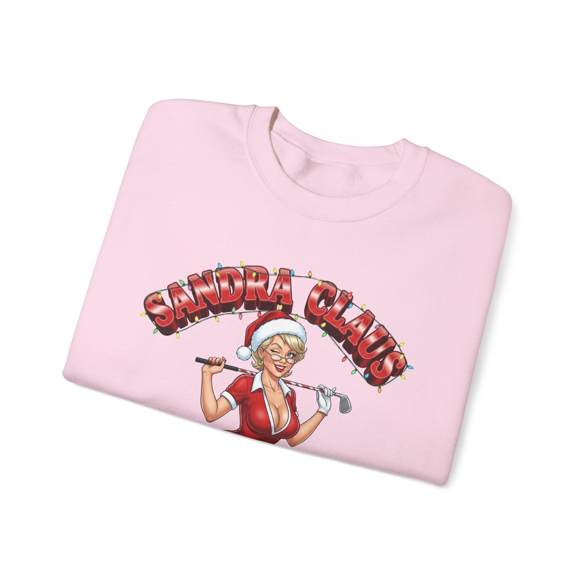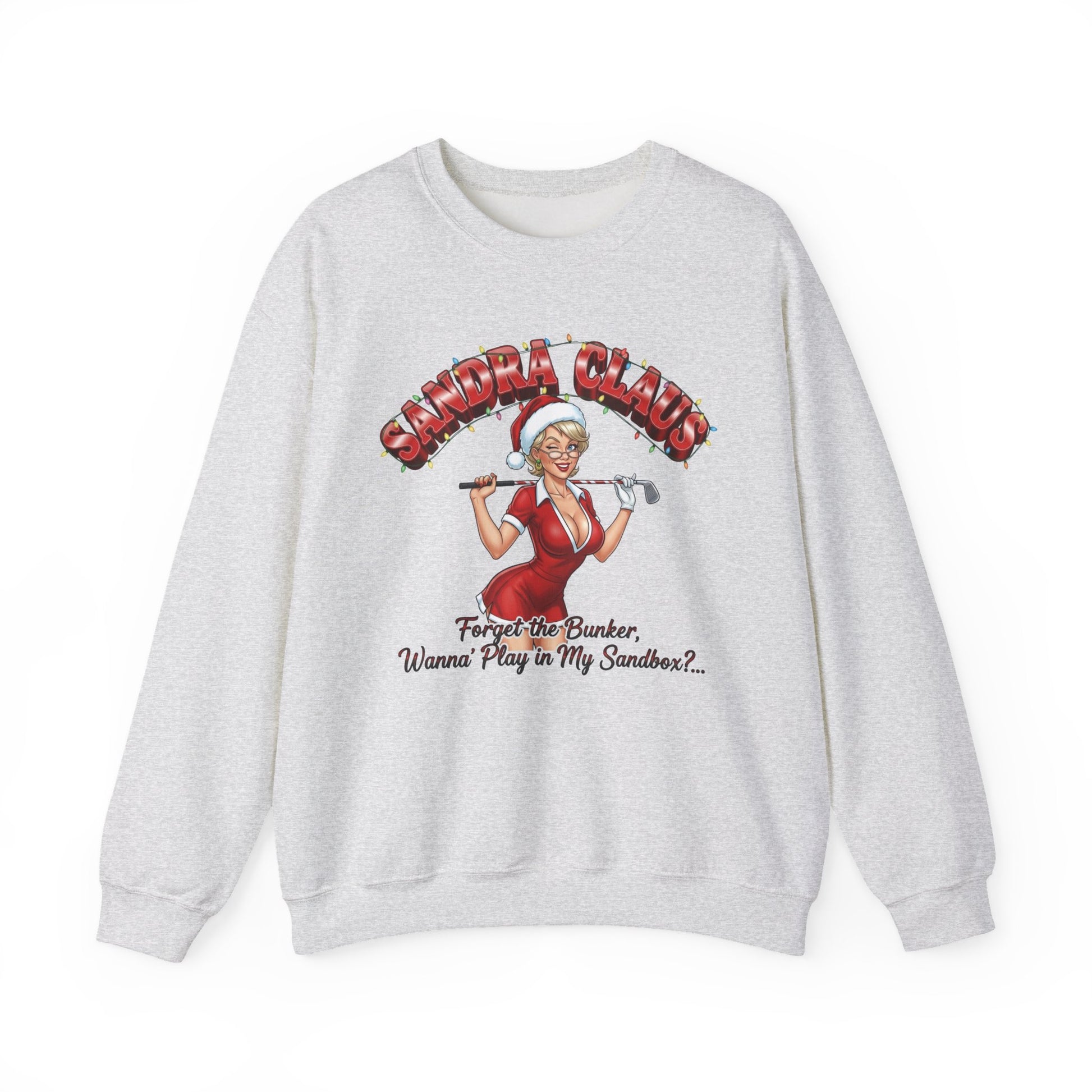 SANDRA CLAUS is Golf's Sweet & Sassy Mrs. Claus. FORGET THE BUNKER, WANNA PLAY IN MY SANDBOX?.. will keep your foursome rolling with this cozy Unisex Heavy Blend™ Crewneck Sweatshirt, or make you the star of the Ugly Sweatshirt Party at the 19th hole every year! SANDRA brings a humorous twist to a classic character, and laughs to those who love to embrace humor and personality in their style. Whether you’re lounging at home or attending a lively get-together, this sweatshirt fits seamlessly into your everyday life, adding warmth and a touch of fun. It’s perfect to spread some cheer around the club, or as a great gift for Christmas, Winter parties. Celebrate the season with style and comfort!
