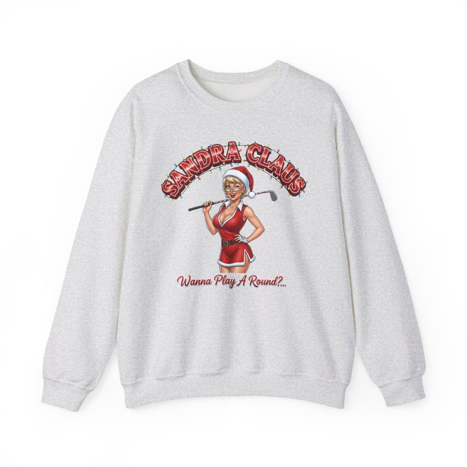 SANDRA CLAUS is Golf's Sweet & Sassy Mrs. Claus. WANNA PLAY A ROUND?.. will keep your foursome rolling with this cozy Unisex Heavy Blend™ Crewneck Sweatshirt, or make you the star of the Ugly Sweatshirt Party at the 19th hole every year! SANDRA brings a humorous twist to a classic character, and laughs to those who love to embrace humor and personality in their style. Whether you’re lounging at home or attending a lively get-together, this sweatshirt fits seamlessly into your everyday life, adding warmth and a touch of fun. It’s perfect to spread some cheer around the club, or as a great gift for Christmas, Winter parties. Celebrate the season with style and comfort!