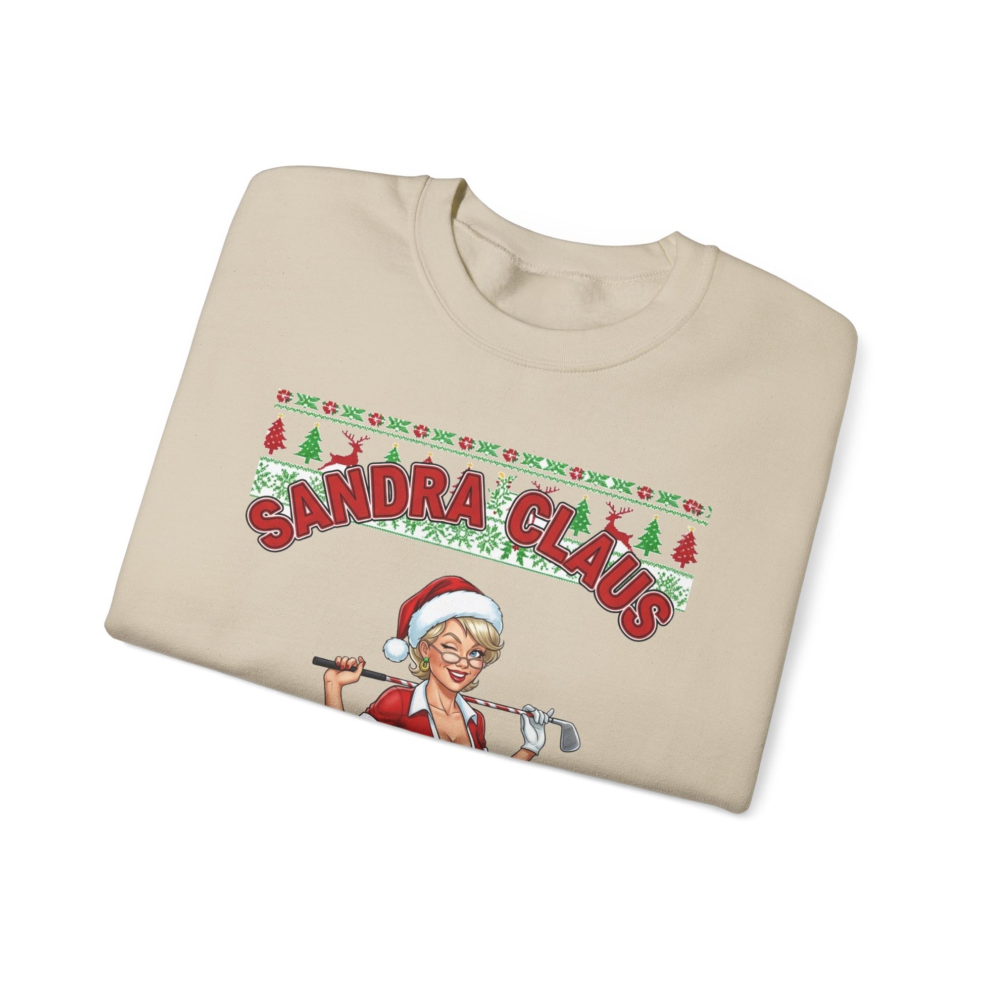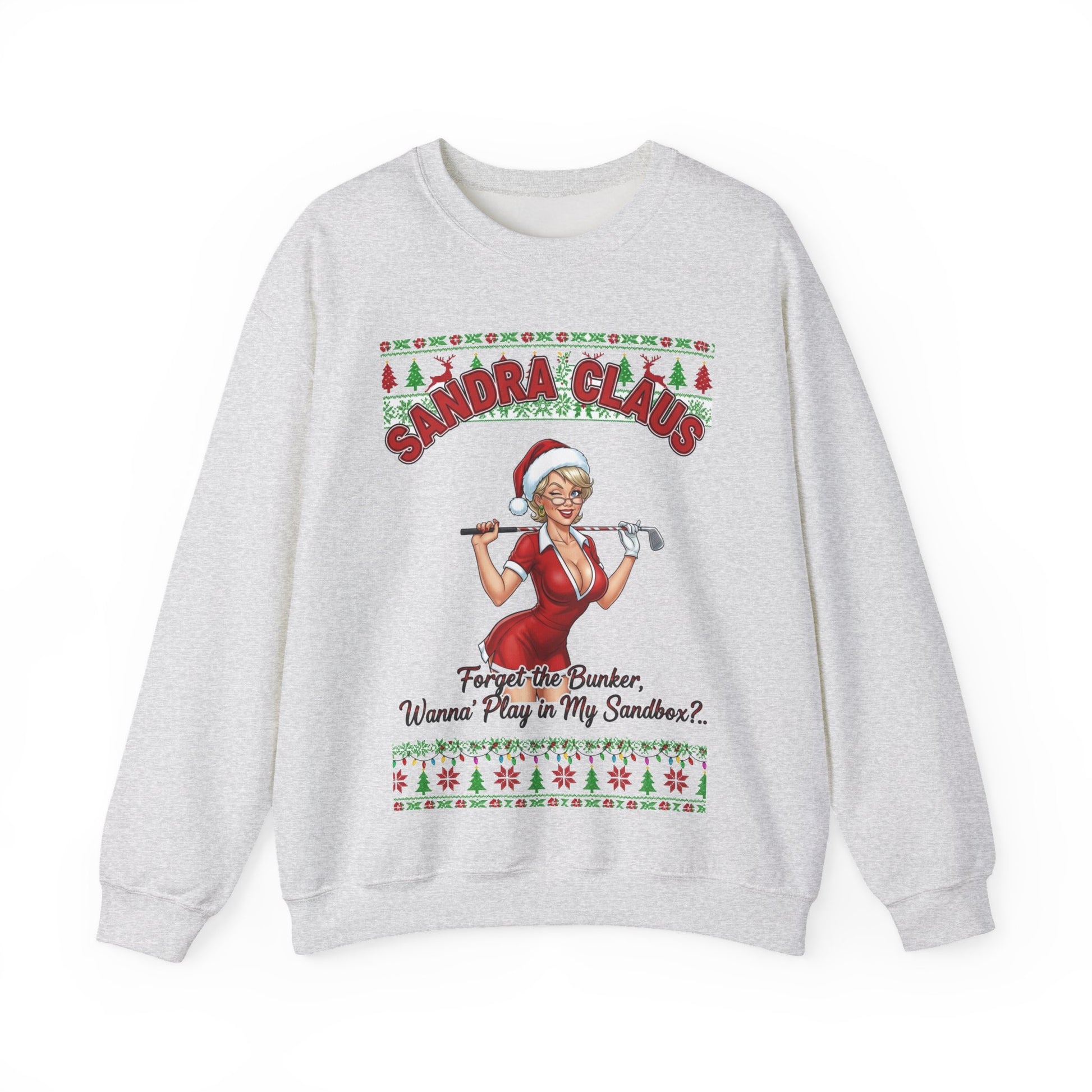SANDRA CLAUS is Golf's Sweet & Sassy Mrs. Claus. FORGET THE BUNKER, WANNA PLAY IN MY SANDBOX?.. will keep your foursome rolling with this cozy Unisex Heavy Blend™ Crewneck Sweatshirt, or make you the star of the Ugly Sweatshirt Party at the 19th hole every year! SANDRA brings a humorous twist to a classic character, and laughs to those who love to embrace humor and personality in their style. Whether you’re lounging at home or attending a lively get-together, this sweatshirt fits seamlessly into your everyday life, adding warmth and a touch of fun. It’s perfect to spread some cheer around the club, or as a great gift for Christmas, Winter parties. Celebrate the season with style and comfort!